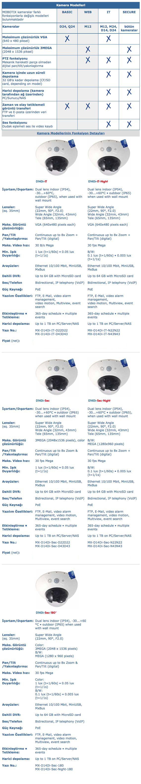 D14 kameranın DNight çeşitleri ayrıca olağanüstü bir bilgi işleme gücüyle ve gündüz ışığında gerçek renkleri görüntüleme özellikleri ve karanlık ortamlarda yüksek duyarlılıklarıyla ön plana çıkıyor. Montajı ise hiç olmadığı kadar kolay ve güvenli: Gece ve gündüz lensleri MOBTEK fabrikasında tam bir paralellikle özel bir DNight lens köprüsünü anahtar teslimi monte edilmektedir. Dolayısıyla gündüz lensi tarafından izlenen alan daima gece lensinin alanıyla aynı olmaktadır. Milimetrik hizalama zorunluluğu veya lensleri kaza ile saptırma riski yoktur!