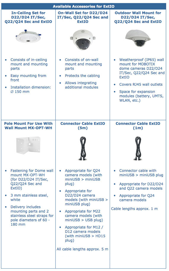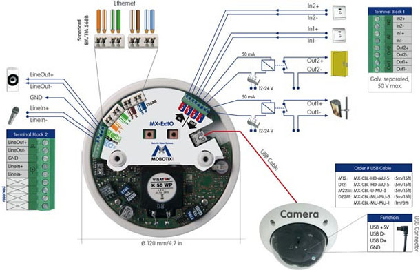 With its new ExtIO module, MOBTEK leads the way to completely new technology. The ExtIO can be connected to a camera either directly via USB or through a network and extends the MOBOTEK camera to a high-performance audio unit with microphone and speaker, infrared motion detector, temperature sensor and additional switch in-/outputs. Door and gate intercom systems are easy to implement using the two illuminated buttons.