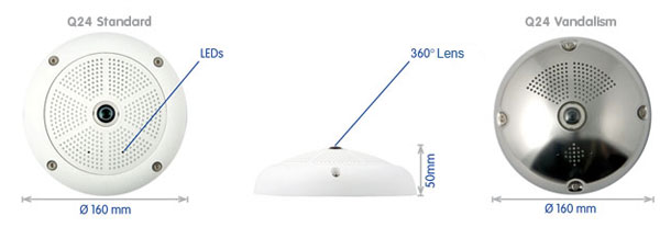Zarif, bütünleşik ve çevresel koşullara dayanıklı IP dome kamera. 360 derecelik çepeçevre görüntü, panorama fonksiyonu ve dörtlü görüntü modu sayesinde Q24 her senaryoda kullanılabilir.
