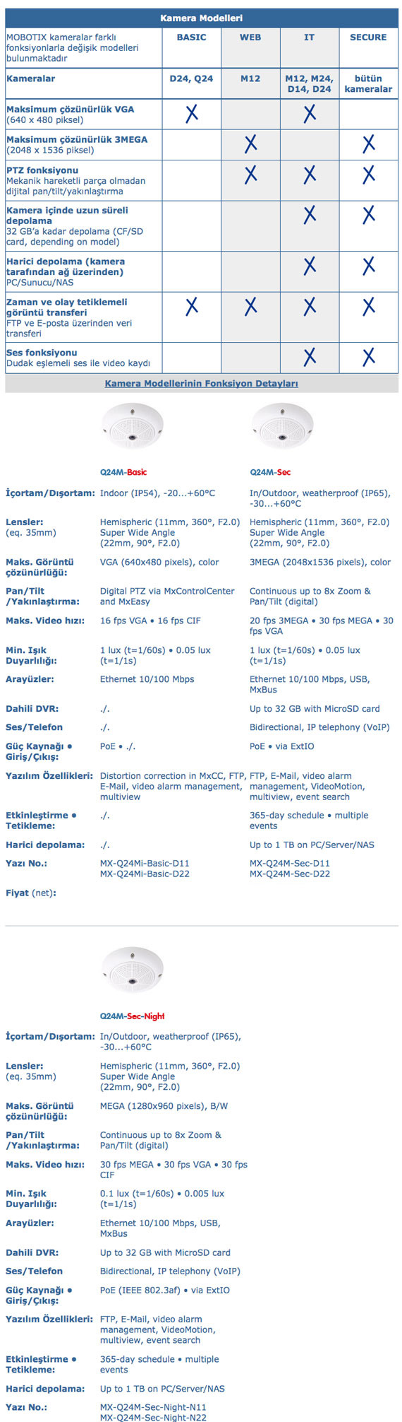Alarmlar/Olaylar | Triggering of events by integrated multiple-window motion detection, external signal, temperature sensor, notification over email, FTP, IP-Telephony (VoIP, SIP), visual/acoustic alarm Pre- and post-alarm images |