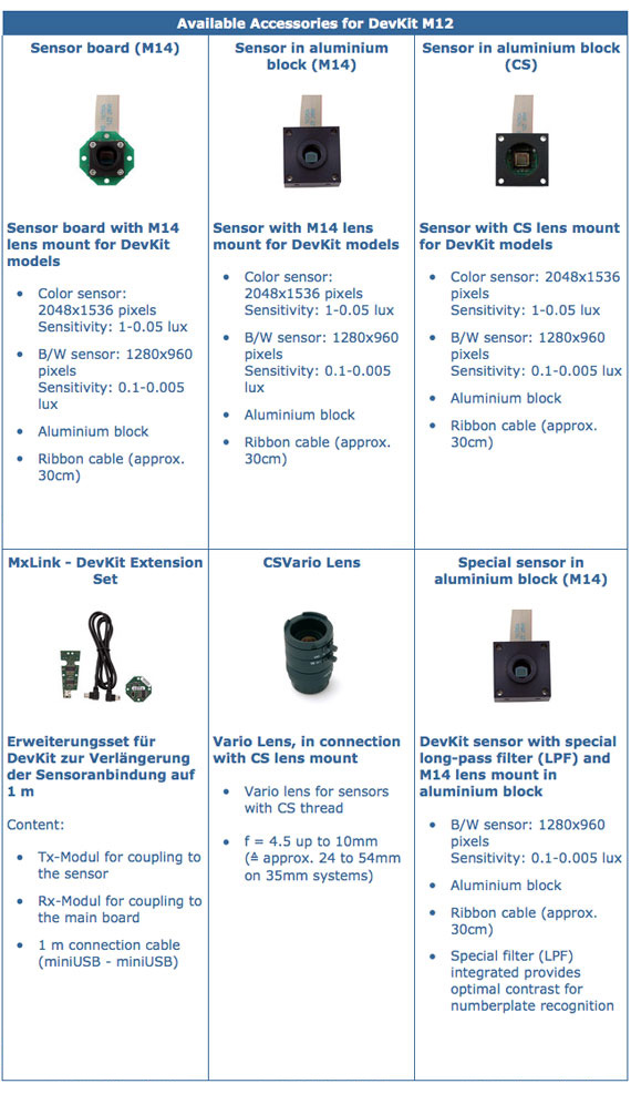 M12 DevKit standart olmayan bütün uygulamalarda kullanılabilir. M12 DevKit, iki farklı görüntü sensörüne sahip, daha çok görünmeyen uygulamalar için tasarlanmış bir çözümdür.