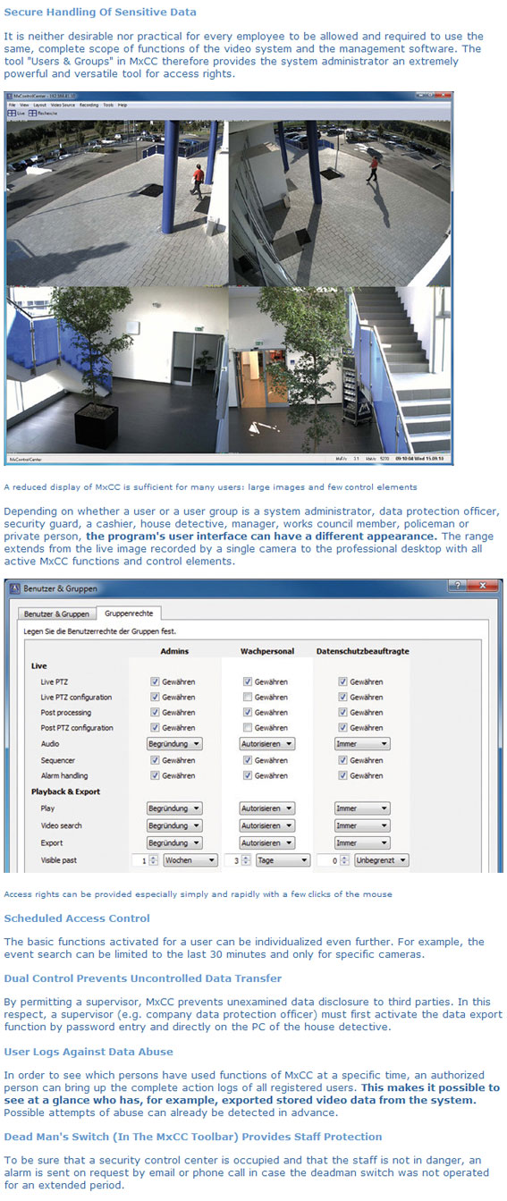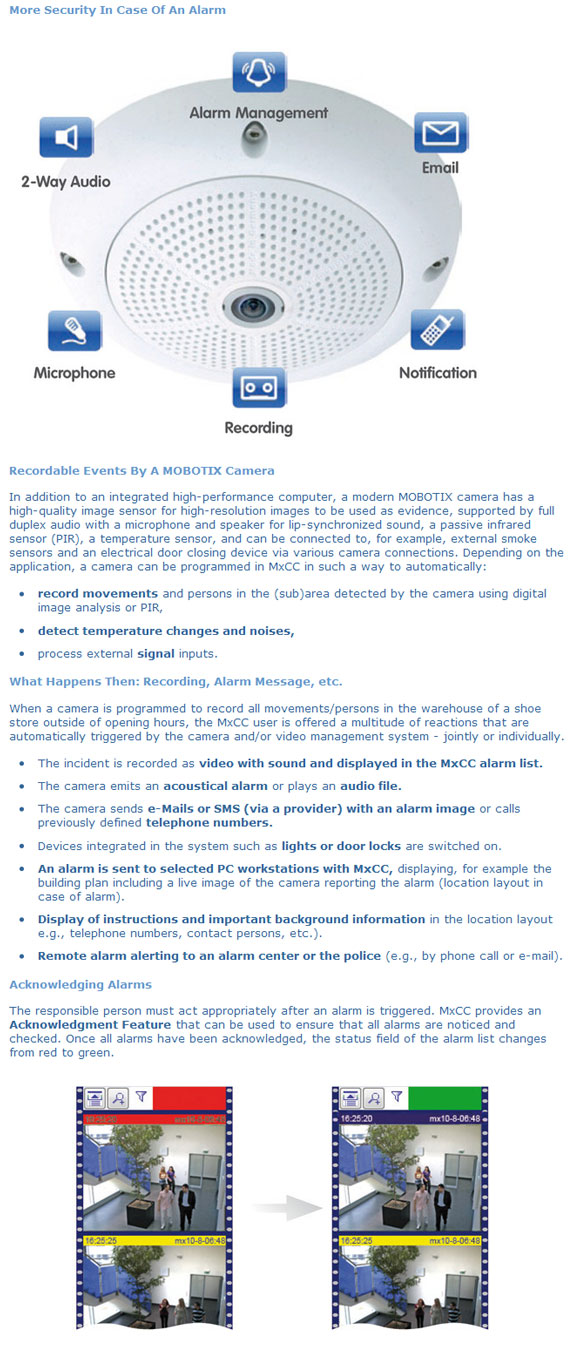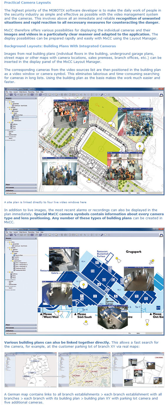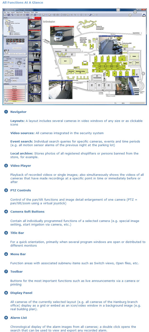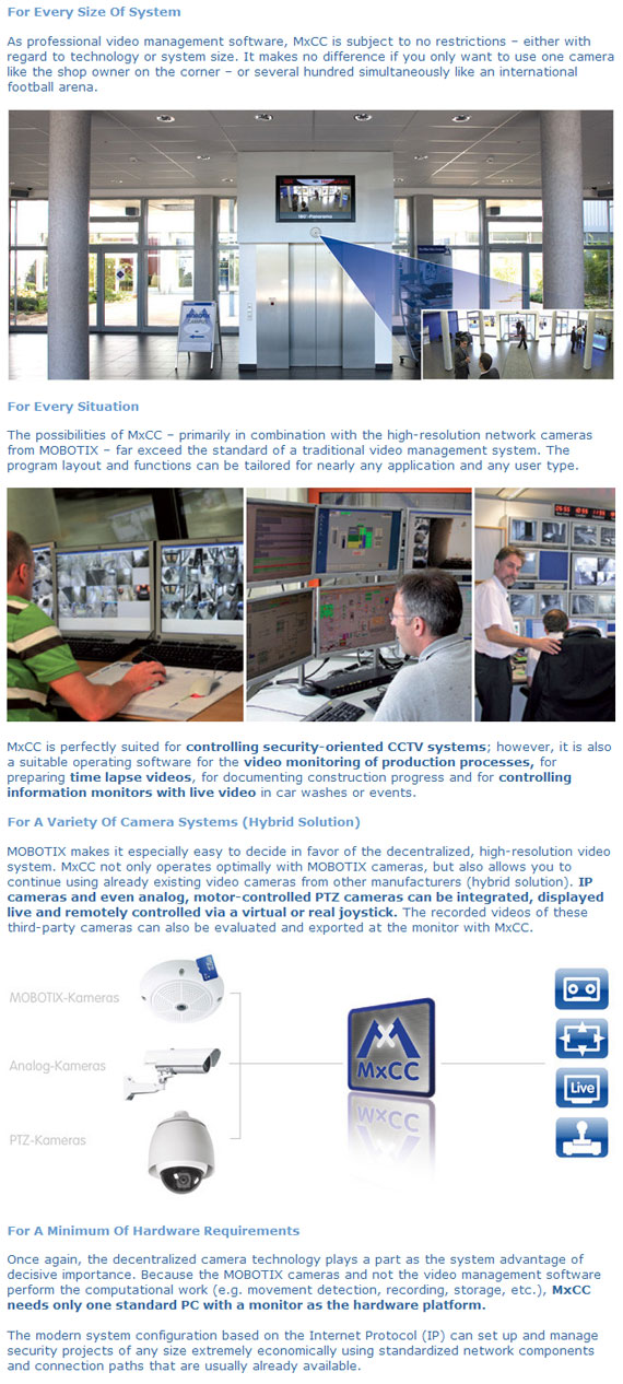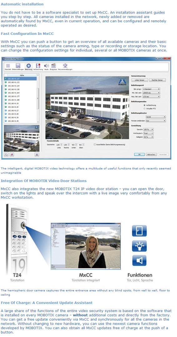 The advanced program, specifically tailored to the high-resolution MOBOTIX network cameras, offers a user-friendly interface and camera display, convenient video search, practical alarm handling, automatic camera integration, video storage on file servers and a useful configuration and update assistant.